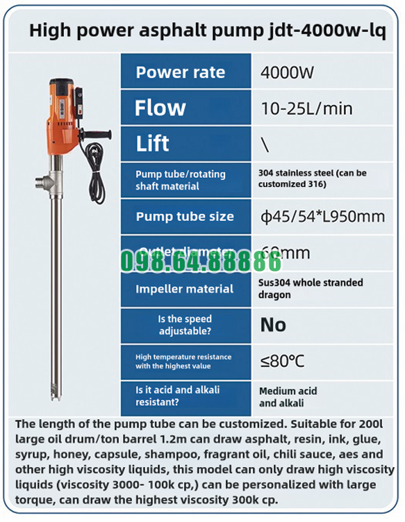 Bơm điện hút chất đặc từ thùng phuy JDT-4000W-LQ là dòng máy rất phù hợp cho thùng phuy 200 lít nhờ thiết kế chuyên dụng cho chất lỏng có độ nhớt cao và cấu tạo tối ưu cho dạng thùng chứa sâu. Đây là lựa chọn thực tế cho các doanh nghiệp cần hút, sang chiết nhựa đường, keo, resin, mực in hoặc các chất đặc khác từ thùng phuy công nghiệp.