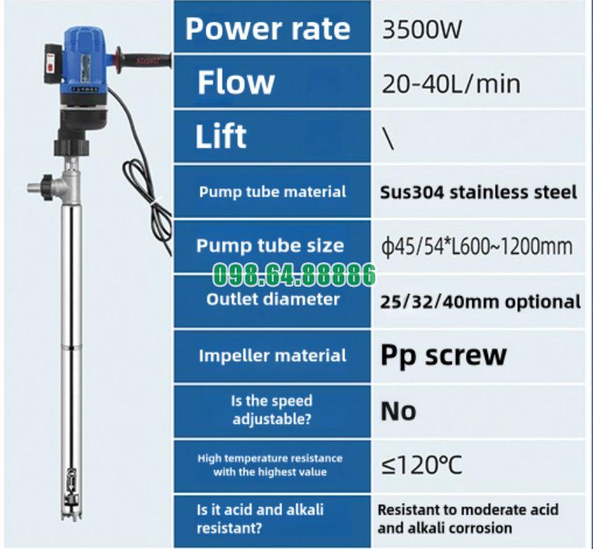 Máy bơm điện cầm tay hút thùng phuy JDT-3500W-LGG120 là giải pháp tối ưu và an toàn khi vận chuyển axit loãng trong các ngành công nghiệp. Nhờ vào vật liệu chống ăn mòn cao, thiết kế khớp nối thông minh, và khả năng làm việc ổn định với các chất lỏng dễ cháy và ăn mòn, máy bơm này giúp tăng hiệu quả công việc và bảo vệ an toàn cho người sử dụng cũng như môi trường làm việc.