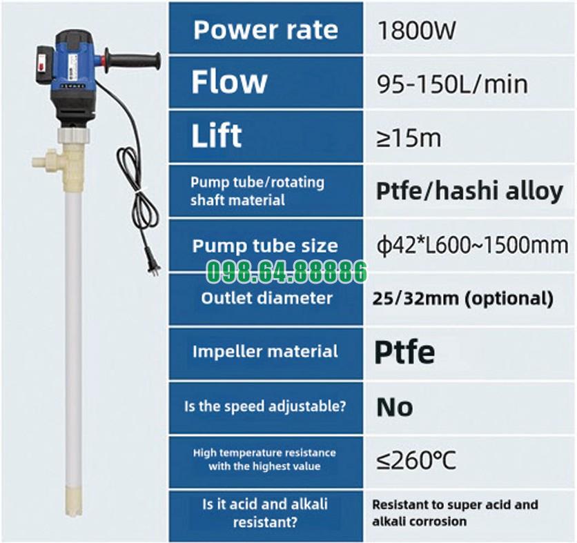 Thông số máy bơm điện chất lỏng chịu axit và kiềm siêu cao JDT-1800W-PTFE