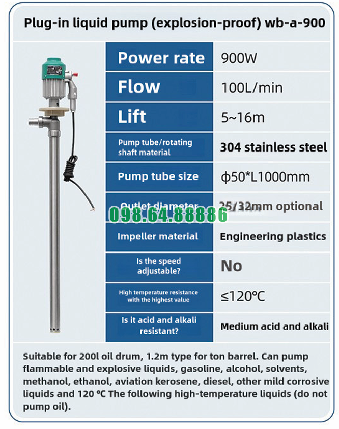 Máy bơm chất lỏng inox 304 chống cháy nổ WB-A-900 phù hợp với các tiêu chuẩn hình học công nghiệp nhờ chiều dài ống bơm 1000mm, tương thích với thùng phuy 200 lít và bồn IBC cao khoảng 1,2m.